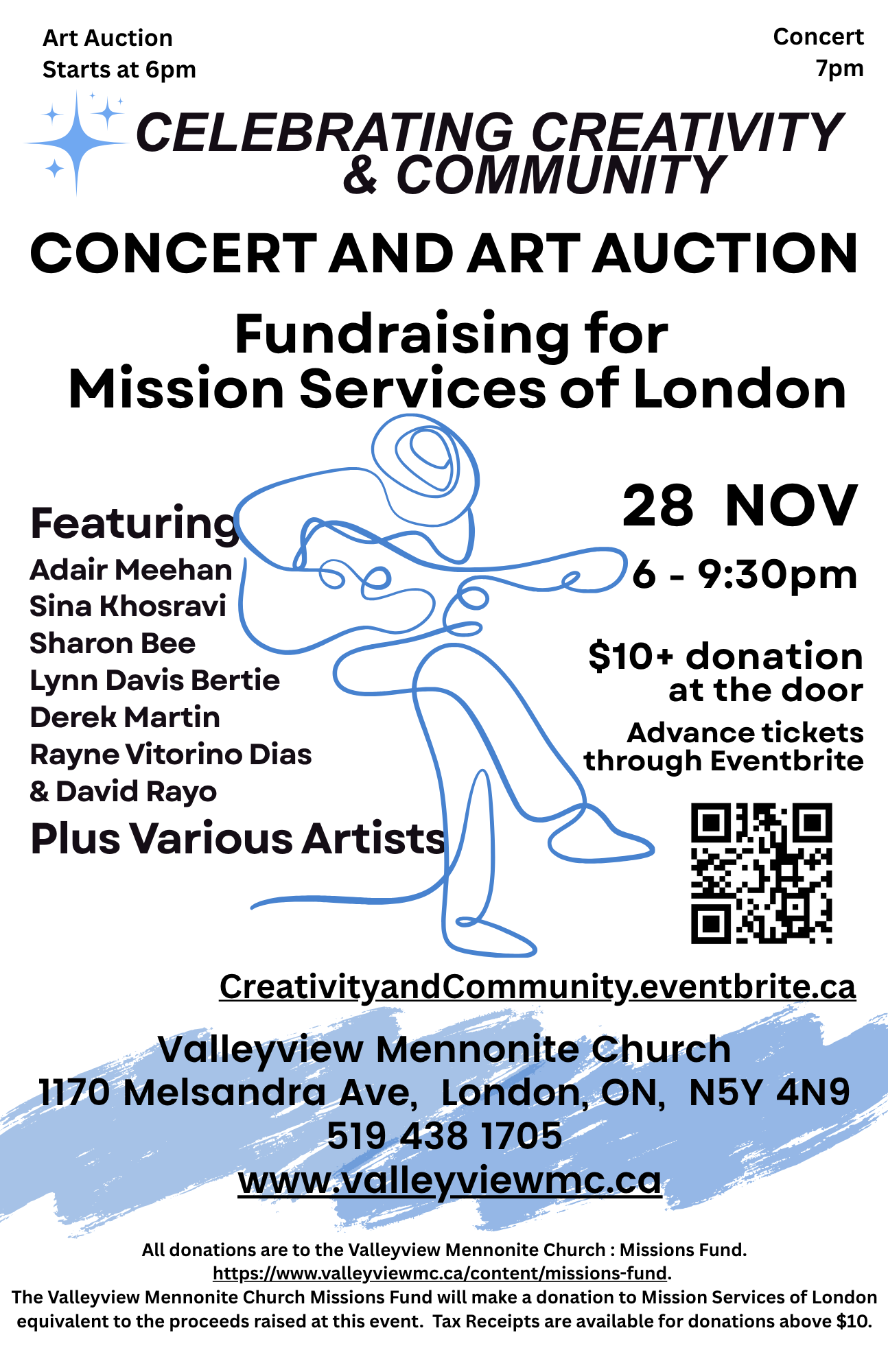 *All donations are to the Valleyview Mennonite Church : Missions Fund. www.valleyviewmc.ca/content/missions-fund. The Valleyview Mennonite Church Missions Fund will make a donation to Mission Services of London equivalent to the proceeds raised at this event. Tax Receipts are available any donation provided above the $10 admission fee.